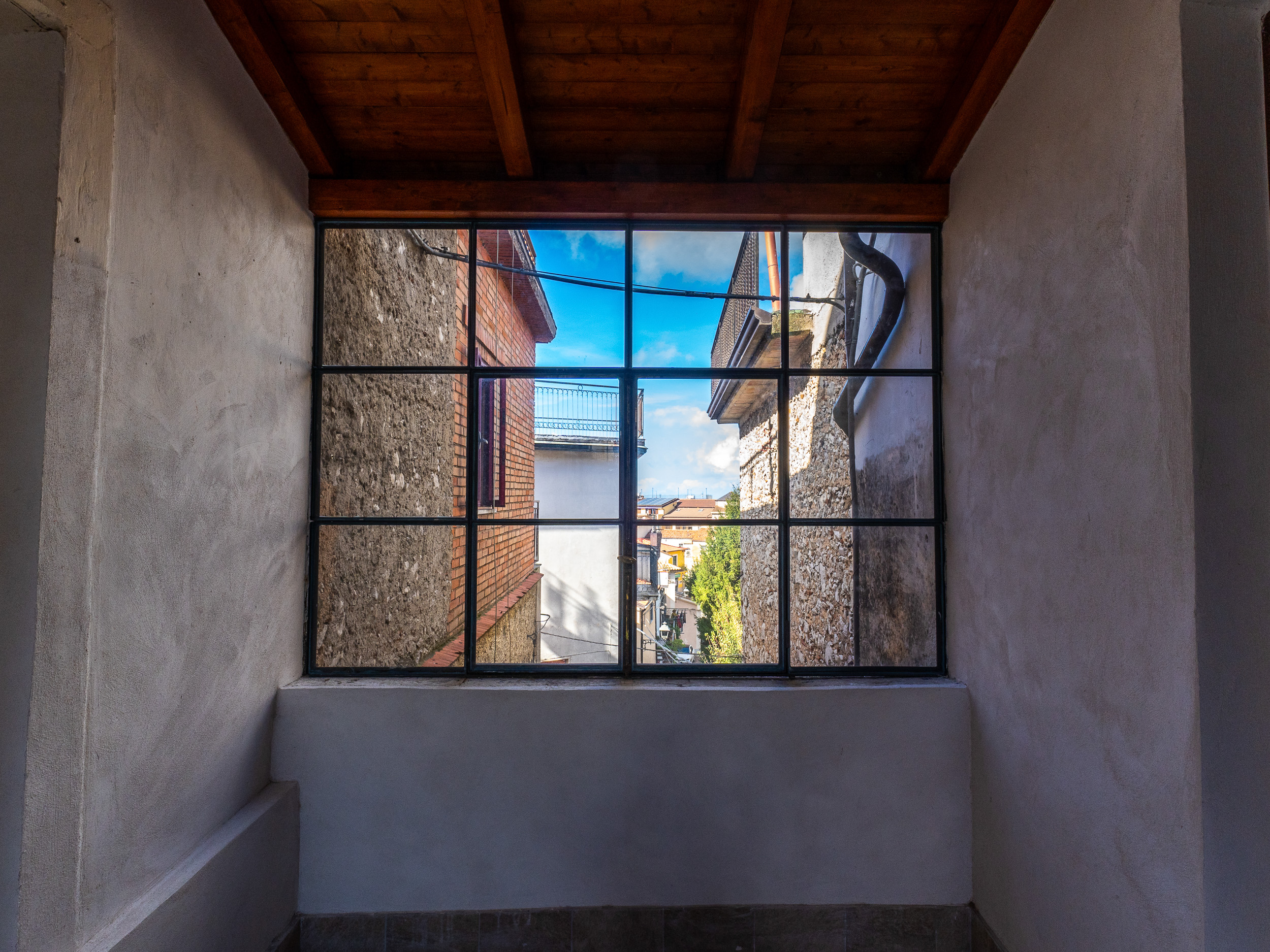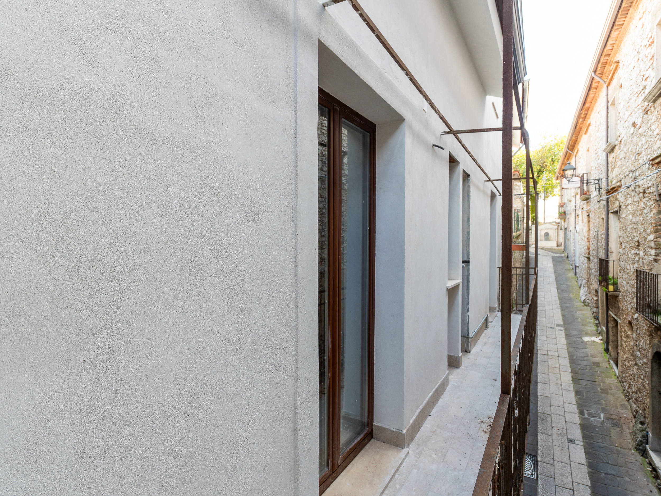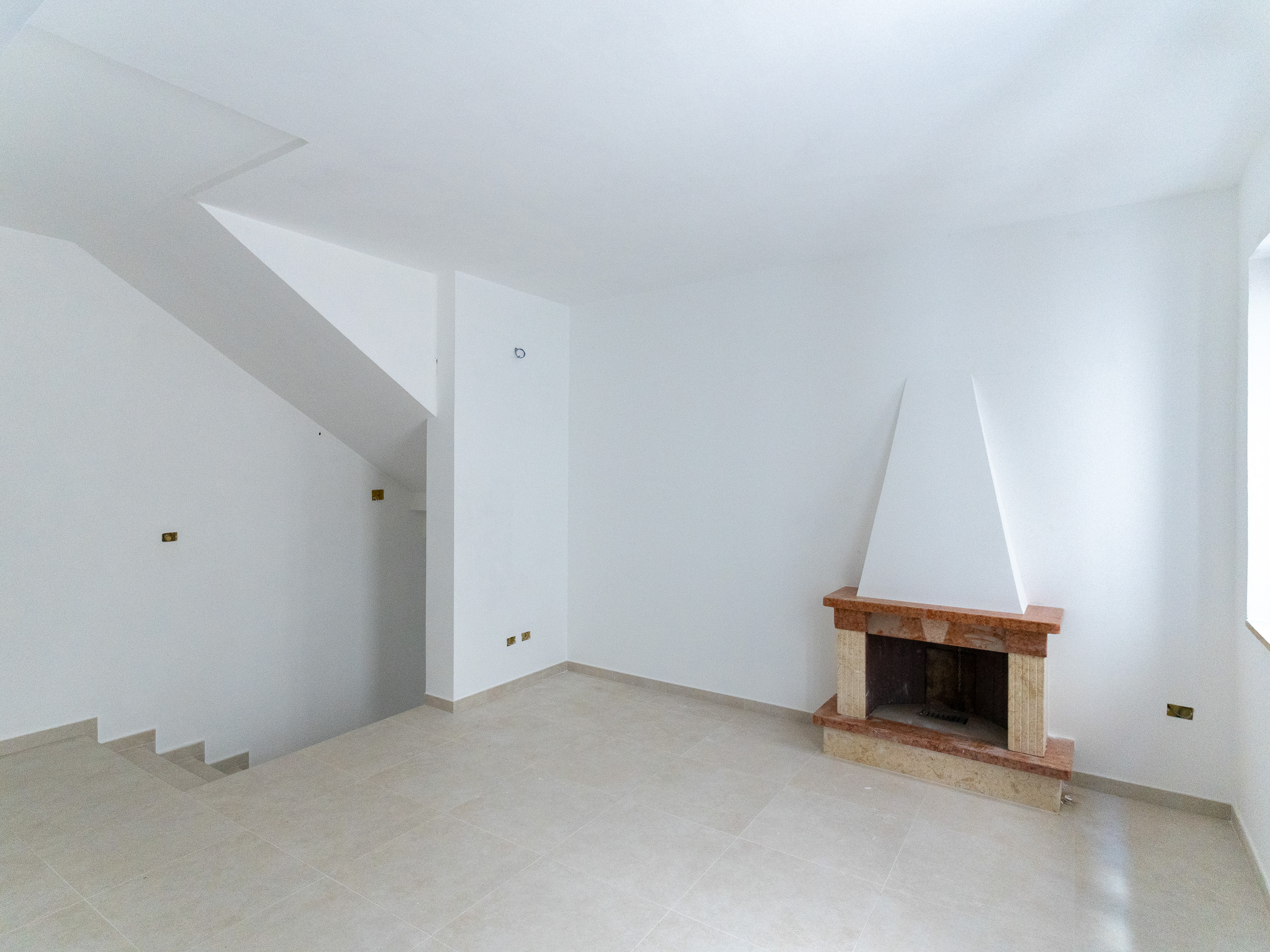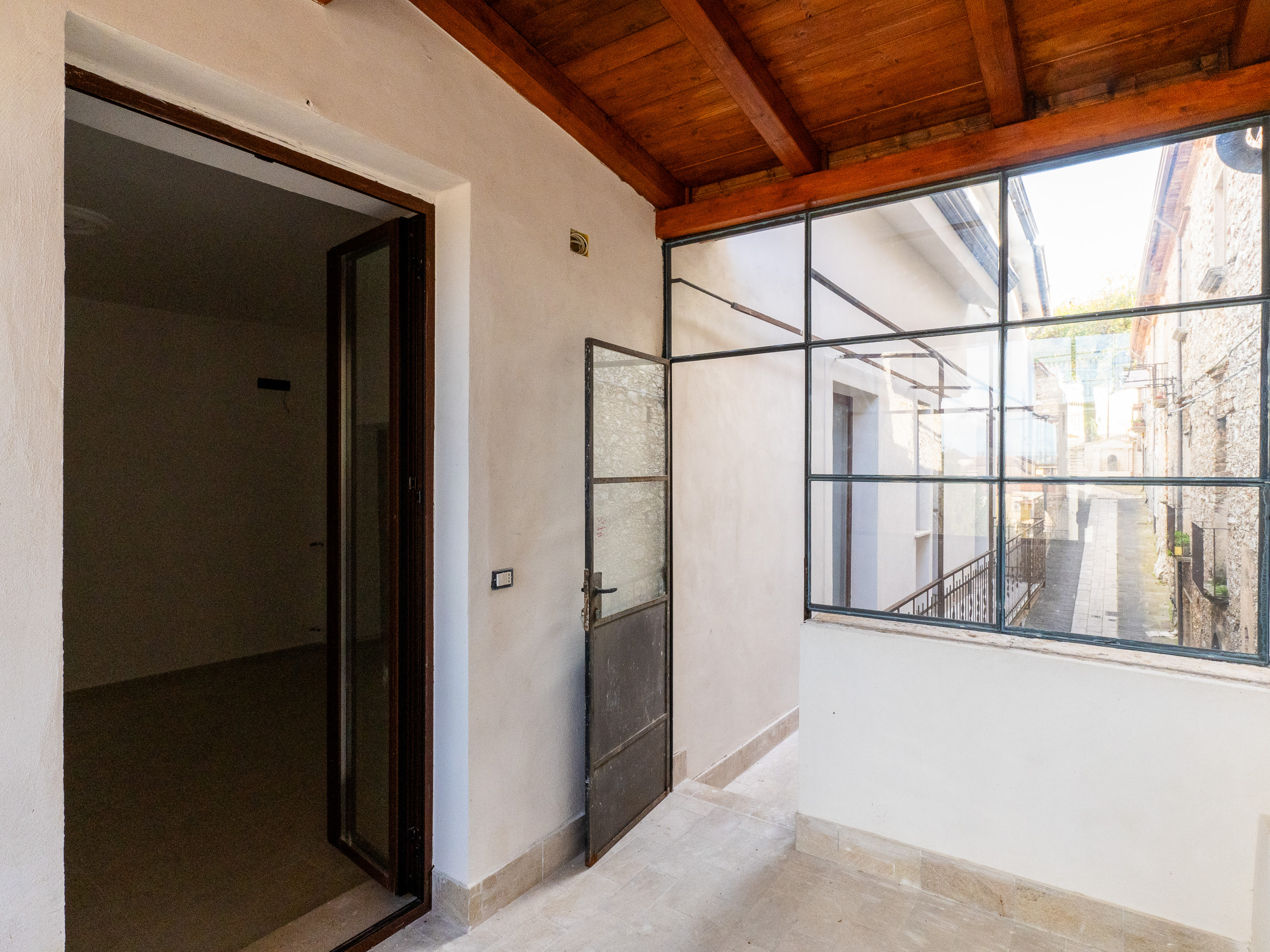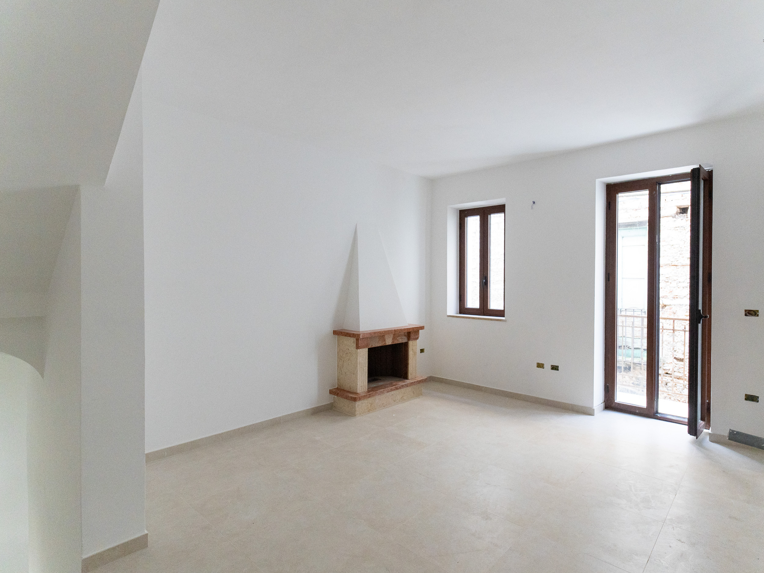 L’ingresso, accogliente e luminoso, ti accompagna verso il piano superiore dove si apre la zona living: un openspace con camino, perfetto per le serate d’inverno o per una colazione davanti alla lunga balconata che si affaccia sui tetti del borgo.