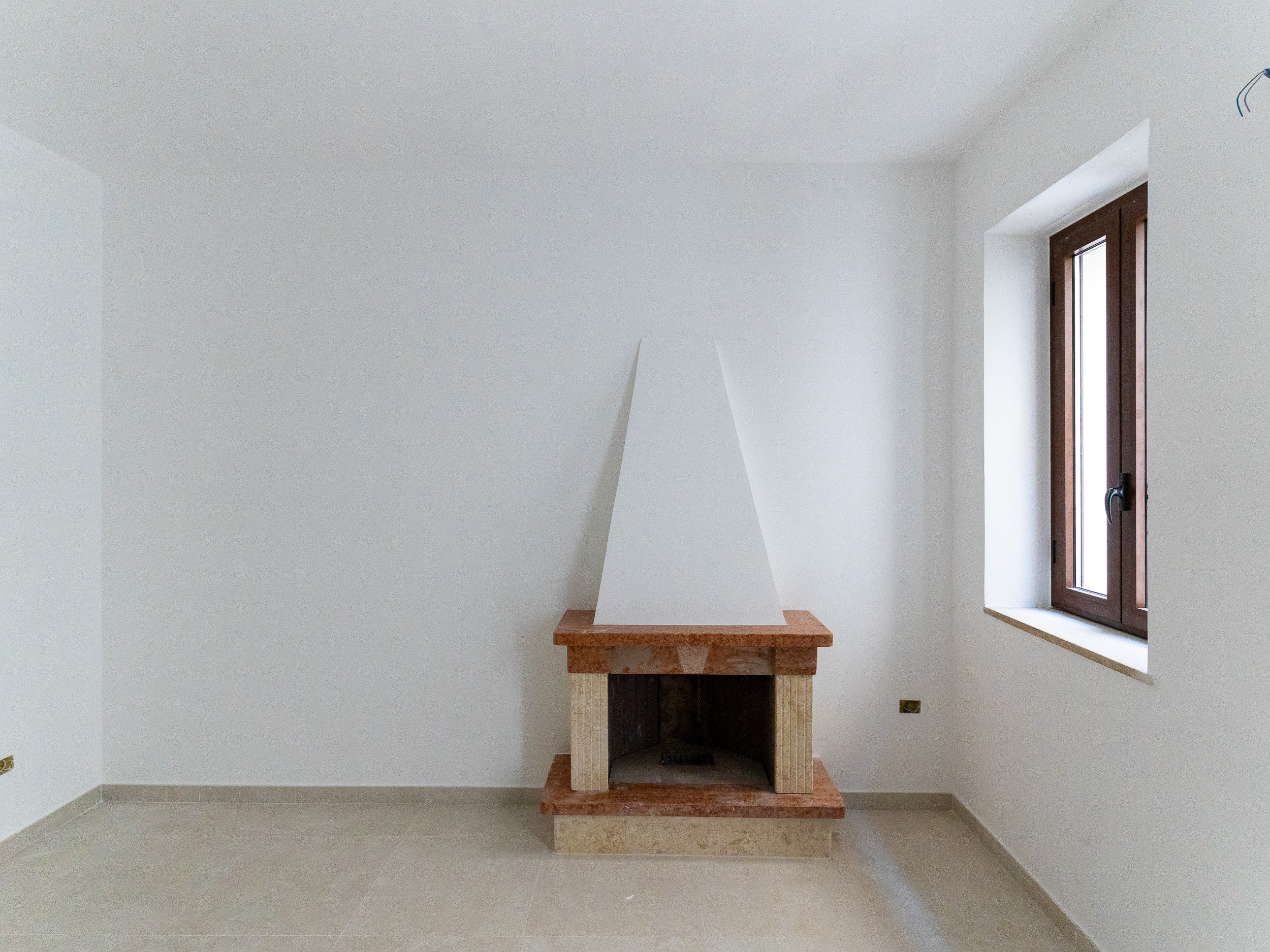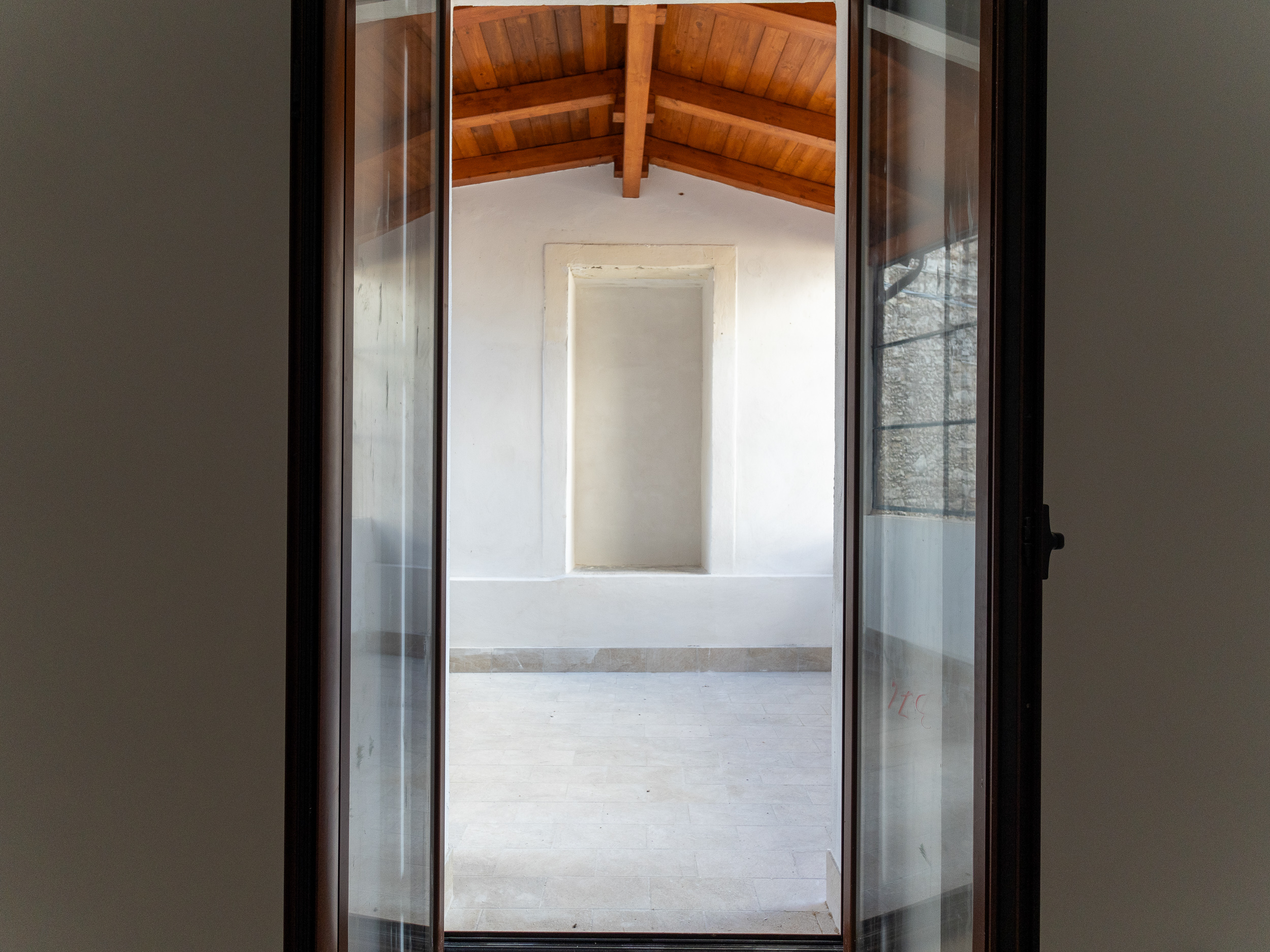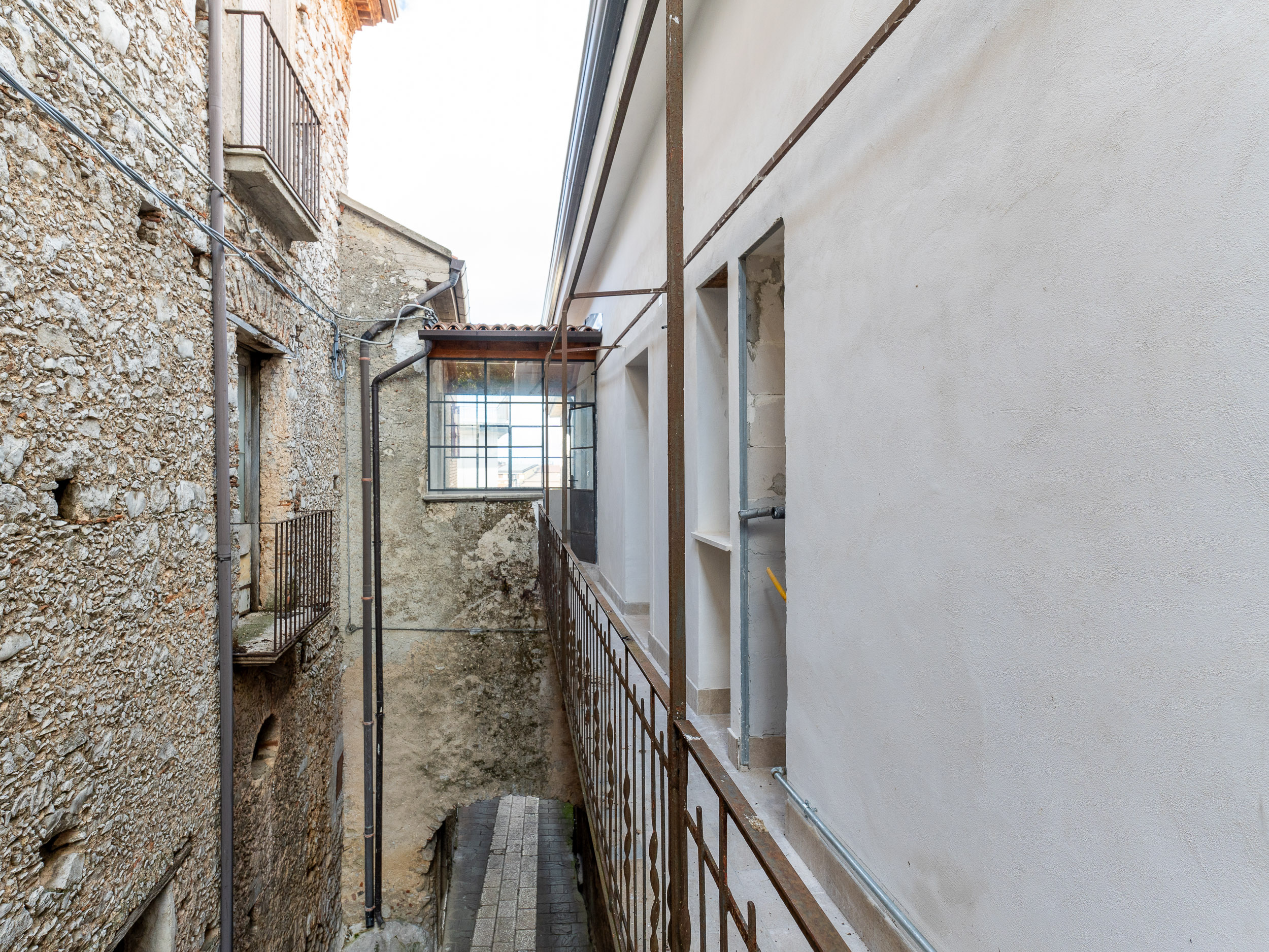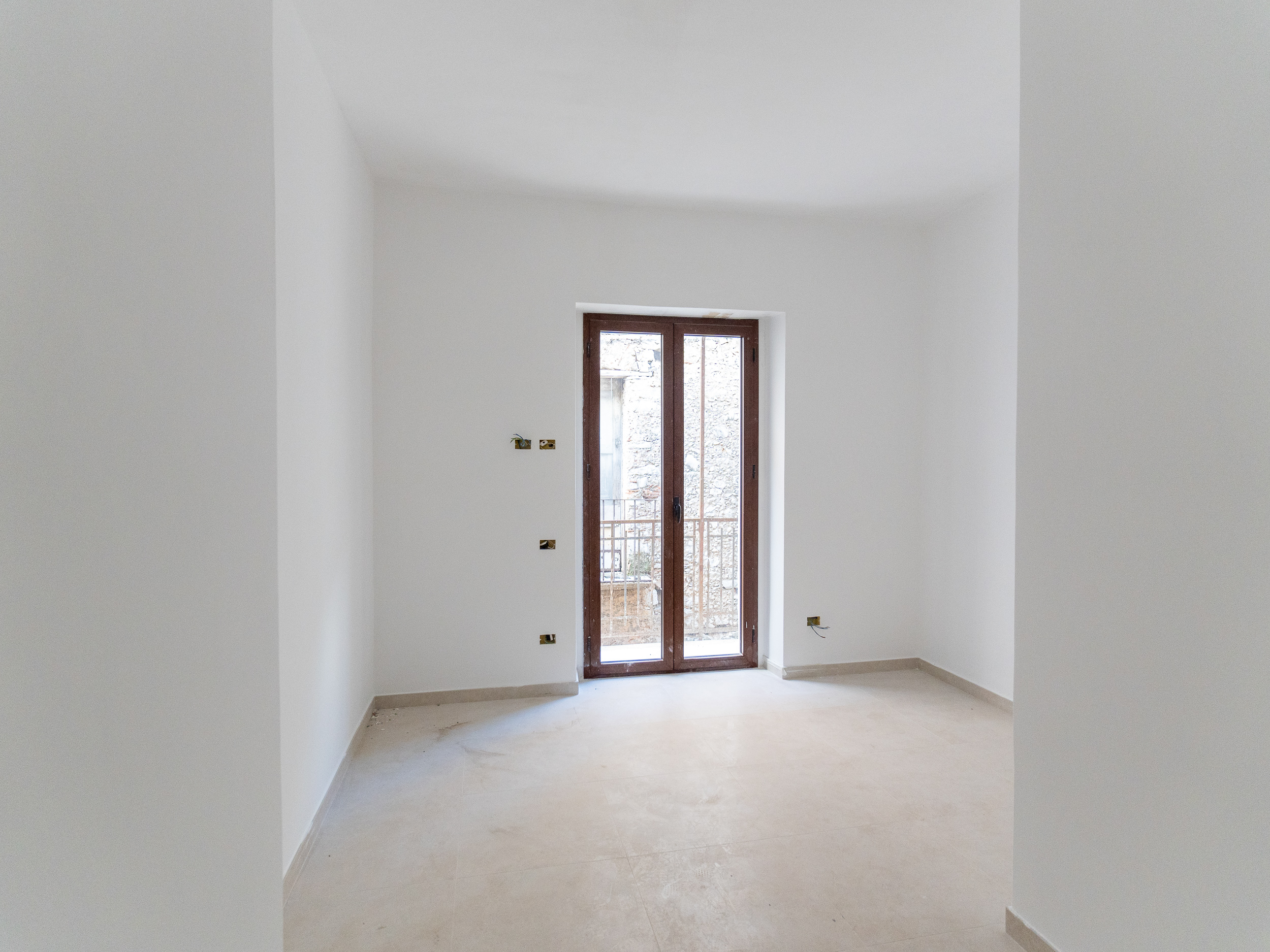 L’ingresso, accogliente e luminoso, ti accompagna verso il piano superiore dove si apre la zona living: un openspace con camino, perfetto per le serate d’inverno o per una colazione davanti alla lunga balconata che si affaccia sui tetti del borgo.