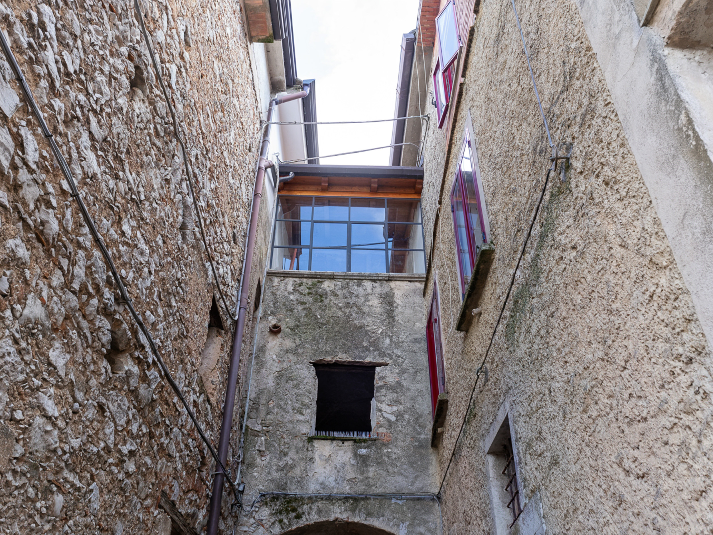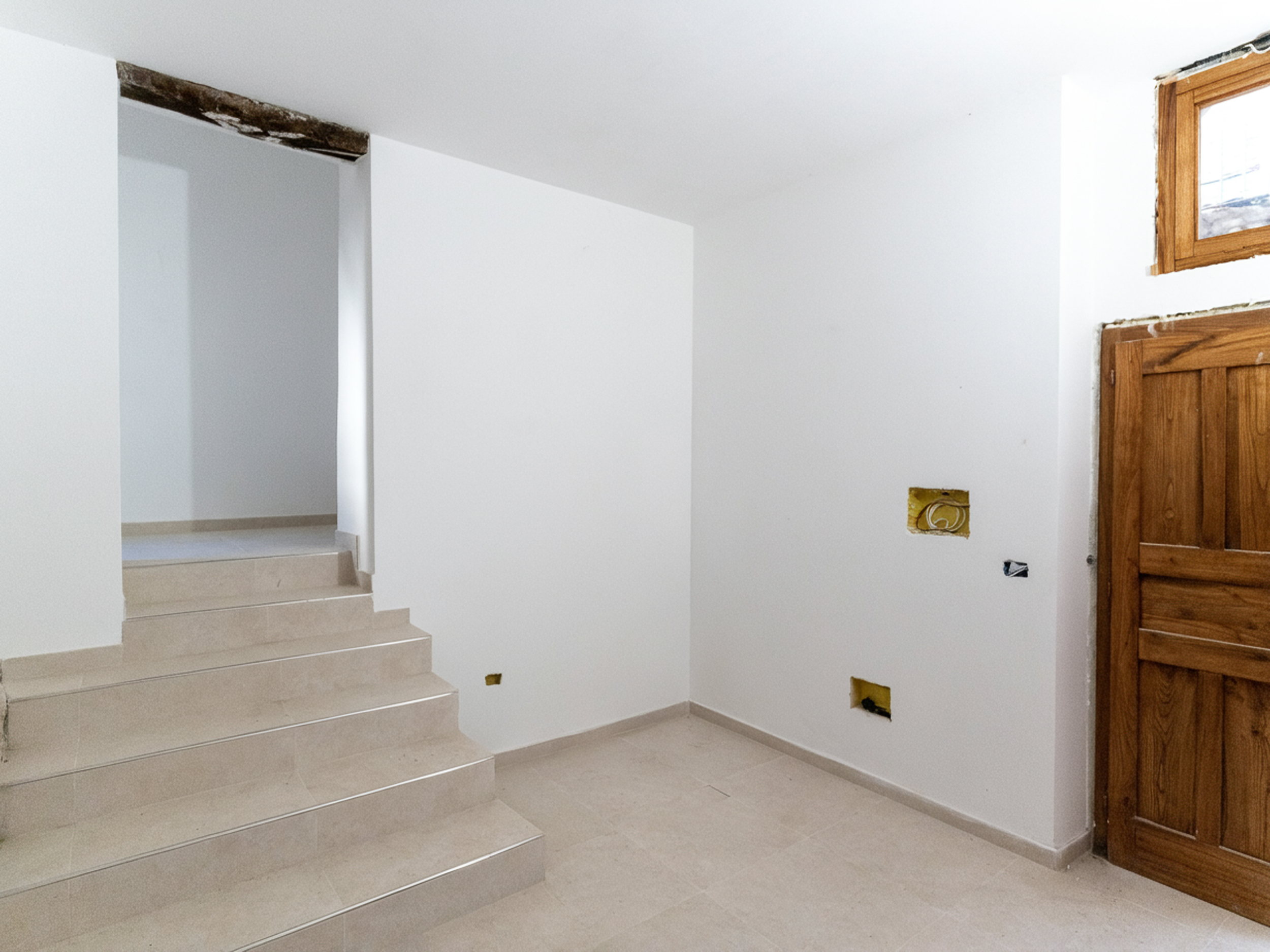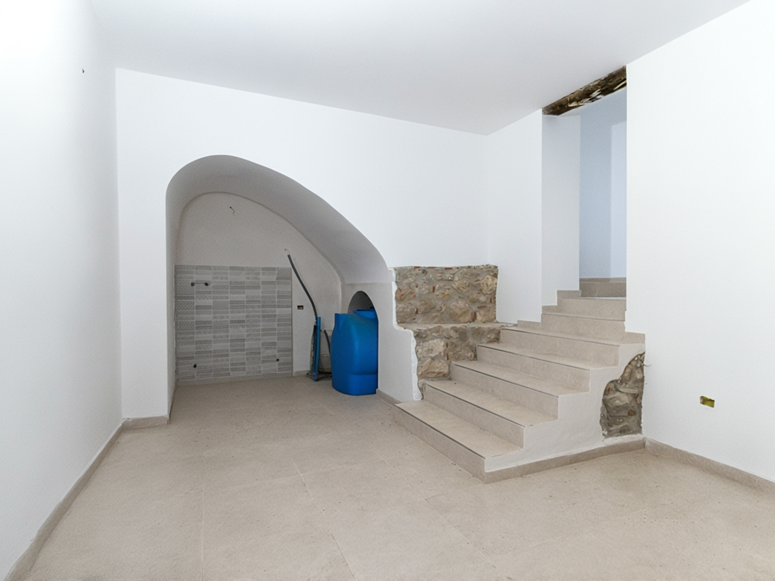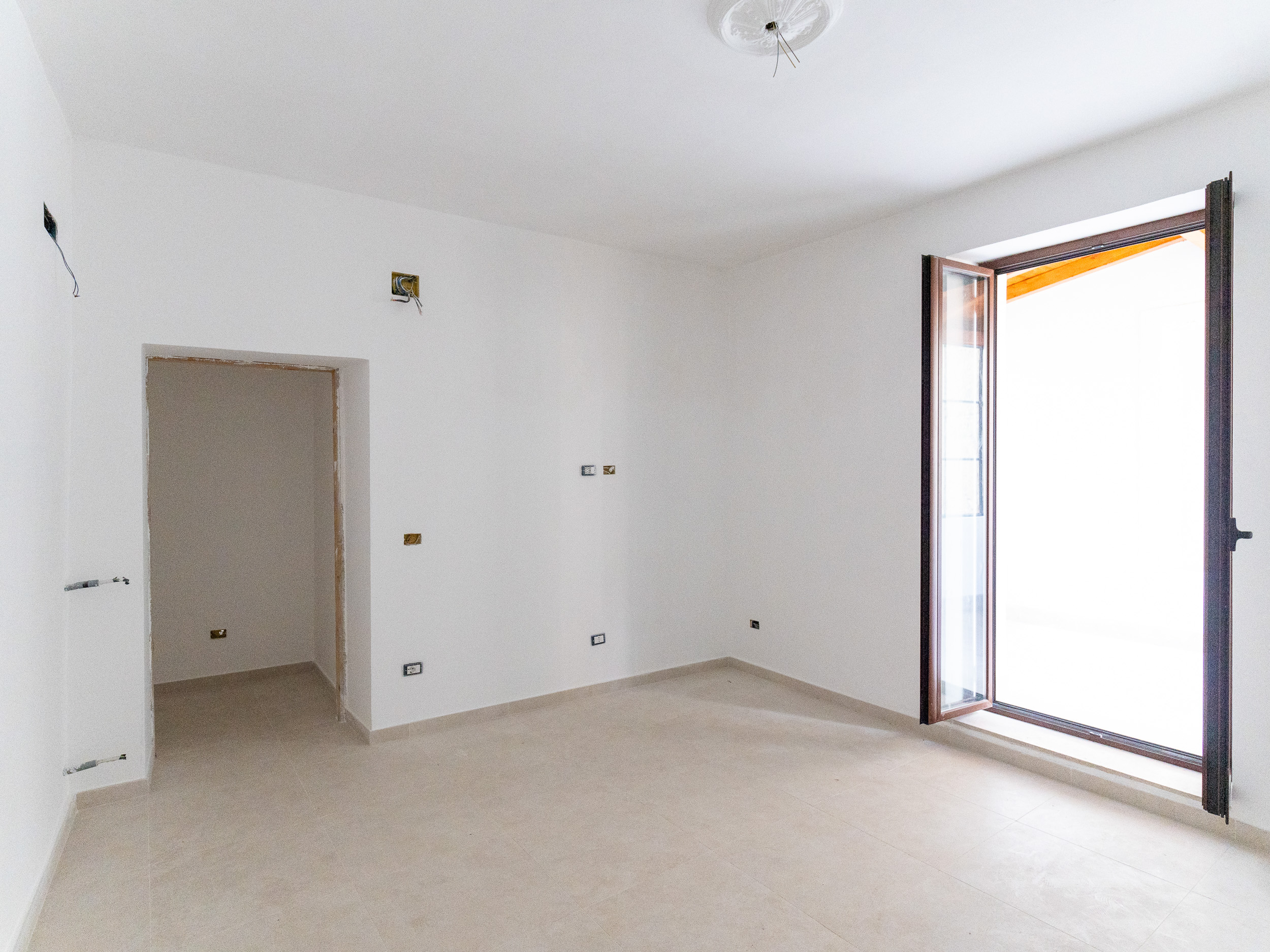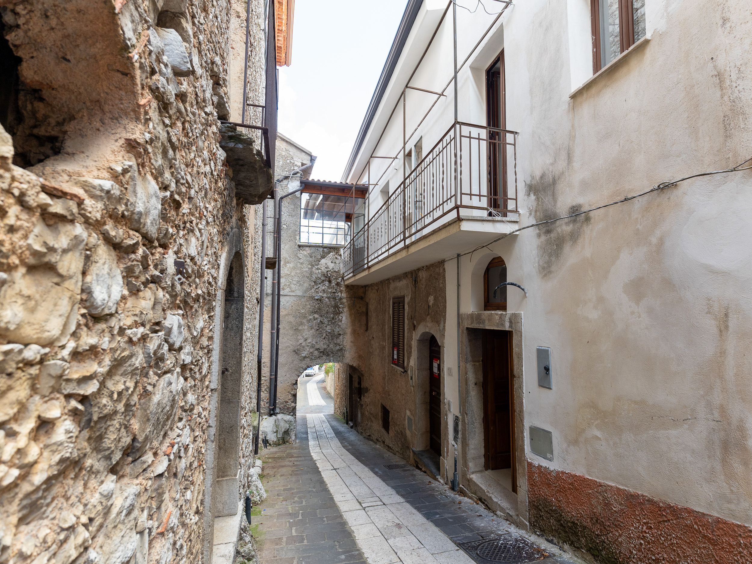 L’ingresso, accogliente e luminoso, ti accompagna verso il piano superiore dove si apre la zona living: un openspace con camino, perfetto per le serate d’inverno o per una colazione davanti alla lunga balconata che si affaccia sui tetti del borgo.